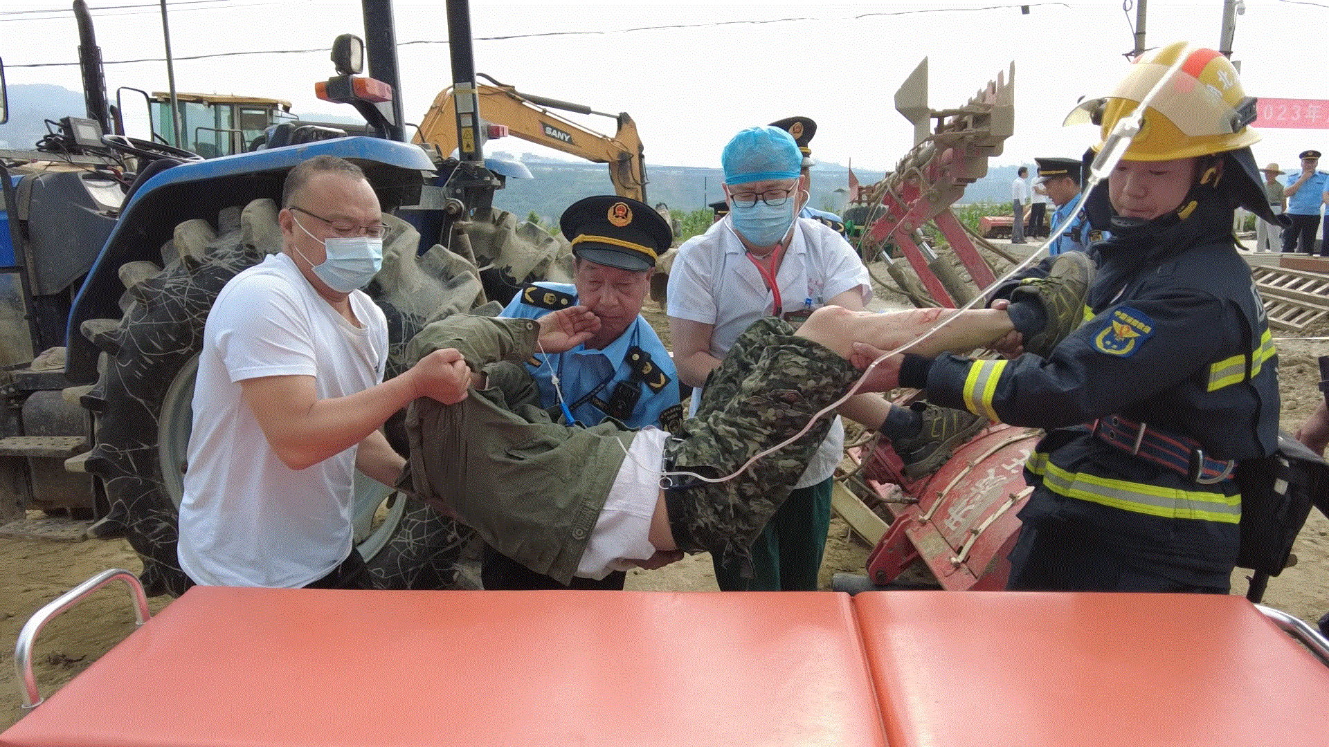 此次演练模拟了一位村名在田间操作拖拉机挂接旋耕机时,因操作不当,造成旋耕机前倾,不慎压伤腿部,导致受伤昏迷、危及生命的农机安全事故。全体参演人员按照演练流程,围绕事故发生、快速报警、现场救援、后续处置等流程,快速反应,真正做到紧密配合、处置有序,圆满完成了演练任务。随后,召开了2023年“农机安全生产月”活动推进会。