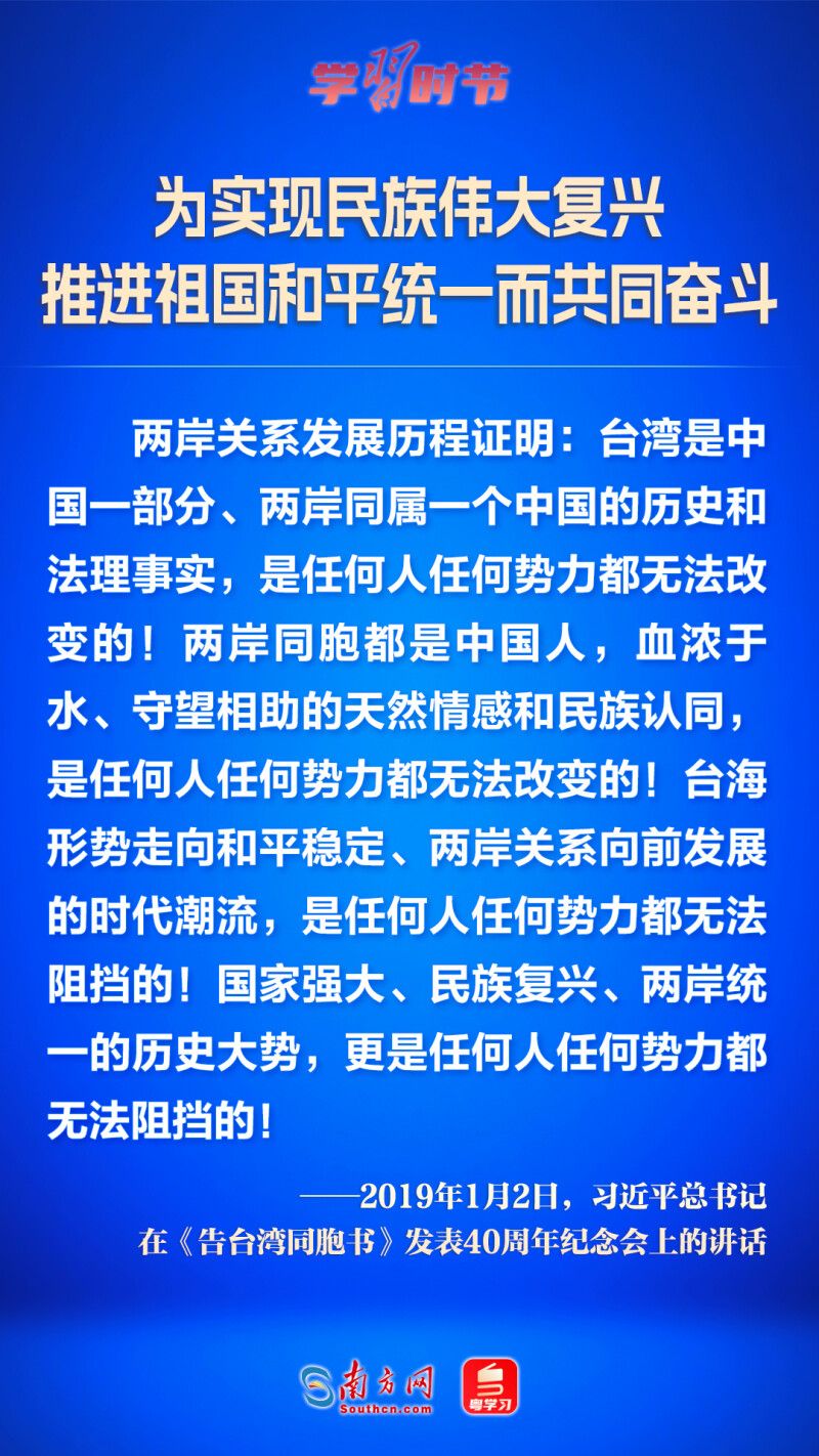 习近平总书记把握历史大势和时代变化,丰富和发展国家统一理论和对台方针政策,形成新时代党解决台湾问题的总体方略,回答了新时代推动两岸关系和平发展、团结台湾同胞共同致力于实现中华民族伟大复兴和祖国统一的时代命题,是做好新时代对台工作的根本遵循和行动指南。