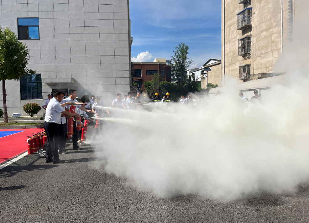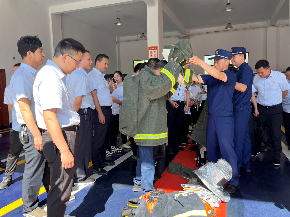 现场体验,提升技能。在体验环节,房县农商行职工在消防人员的带领下,熟悉和了解各类灭火和救援器材的用途以及各种消防车辆的功能。“这是50多米的消防云梯车,主要用于高空施救。这是耐火、耐热、具有隔热性的灭火救援服,整套装备有30斤重。这是液压扩张器、防蜂服、泡沫车……”在学习过程中,大家对“新奇”器材产生了浓厚的兴趣,主动体验各类服装装备。随后组织全体职工进行灭火实操和消防车出水演练活动。活动结束后,前来参观体验的农商银行全体职工与消防人员合影留念,纷纷为“蓝朋友”送上了热烈掌声。