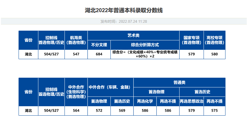 湖北省录取分数线