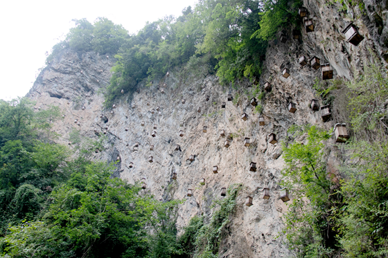 听!“嗡嗡”的声音在我们的耳边回旋着,小小的翅膀带动着它们的身体飞到它们最终的“家”;周围的流水“哗哗”地流动着,无限循环着为这一处添加不少生机。看!这悬崖峭壁上居然悬挂着上万个蜂箱,那种视觉的震撼是你无法想象到的。这小小的蜂箱里面居住着成千上万的可爱的中华蜜蜂,它们无时无刻的在劳动着,筑起一道道“坚固”的蜂巢,产出那可口的蜂蜜。