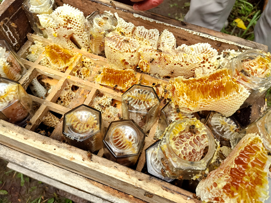 我们每个人幸运的看到了从峭壁上取下来的蜂箱,只见一个养蜜人沿着梯子小心翼翼的把蜂箱取下来,另一个养蜜人双手托举着,顺利地把蜂箱从那峭壁上取了下来。见证“奇迹”的时刻到了,我们要见到这些蜜蜂的“家”了,这是他们用了一年的时间,建造起来的。因为这个蜂箱是密封的,养蜜人必须用工具把固定的钉子螺丝等取下来,两个人合力把盖子掀开,这里需要注意的是,动作必须要慢,以免惊扰了里面的蜜蜂。一道道纹路被蜜蜂弄的整整齐齐的,不见一丝凌乱,而蜂蜜们仍然在里面劳动着。金黄色占据了我们的眼球,就如那有规则的画一般,印在了我们的心里。