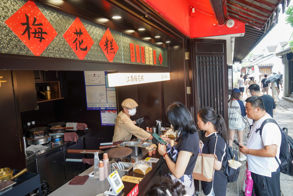 7月6日,游客在平江路一家小吃店选购特色小吃。