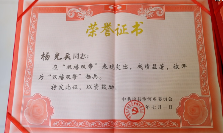 杨光兵的成功,让他和他的家庭农场先后获得“县级示范家庭农场”、沙河乡“产业带头人”“返乡创业带头人”“双培双带”标兵、全县“县级重点示范家庭农场”等多项荣誉。
