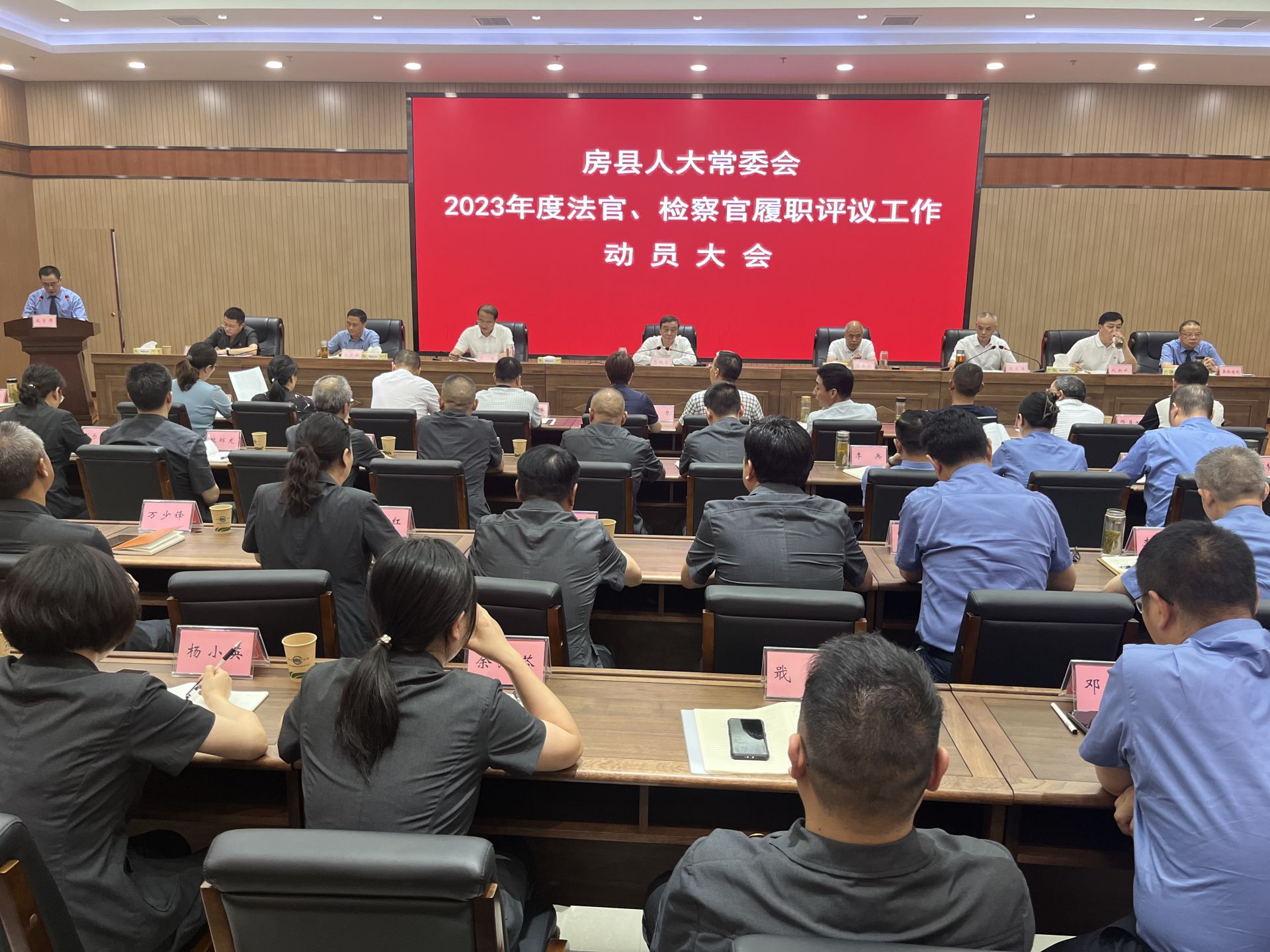房县新闻网讯 记者 绳晓 实习生 孙滢 报道:7月12日,县人大常委会组织召开2023年度法官、检察官履职评议工作动员会,部署“两官”履职评议工作,并现场公布被评议法官、检察官名单。县人大常委会主任高明哲,县人大常委会副主任李自权、丁杰、饶正涛、彭茂盛出席会议。