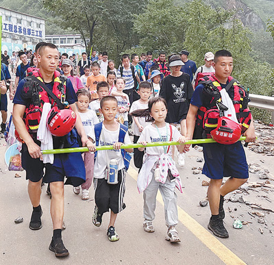 8月2日,北京市消防救援总队特勤支队和门头沟支队的消防救援队伍指战员护送旅客转移。
