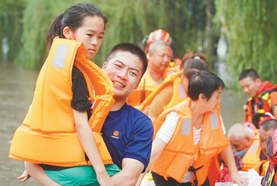 8月2日,救援人员转移北京市房山区琉璃河镇平各庄村的受灾群众。