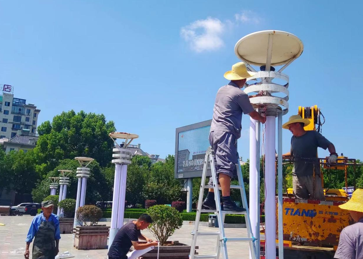正值盛夏,路灯所的工人师傅们冒着高温、顶着烈日,汗流浃背的奋战在工地上,经过近一个月的紧张施工和安装调试,共维修西河广场高杆灯4套,半岛湾公园景观灯60套,迎宾广场柱头景观灯10套,更换景观灯灯罩30根,新装射灯4套。