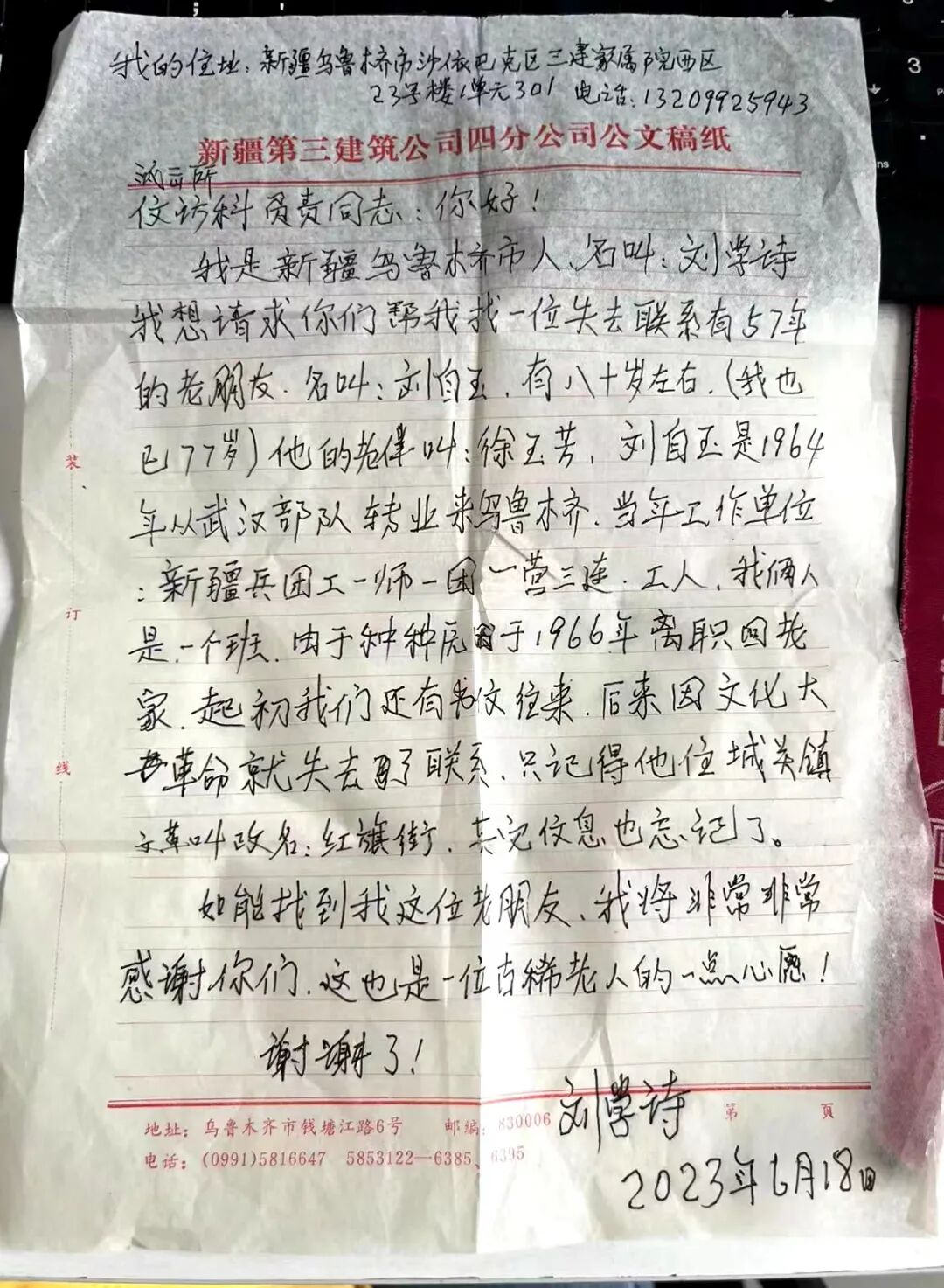 7月25日,房县公安局收到一封信,该局网监大队教导员、外宣工作负责人魏世银拆开信看到,这是新疆老兵刘学诗寻找失去联系战友的信件。信中写道:“我是新疆乌鲁木齐市人,名叫刘学诗。我想请求你们帮我找一位失去联系57年的老朋友,名叫刘自玉,约八十岁。他的老伴叫徐玉芳。刘自玉是1964年从武汉部队转业来乌鲁木齐。由于种种原因,刘自玉于1966年离职回老家。起初我们还有书信往来,后来失去了联系,只记得他住在房县城关镇红旗街,其它信息已忘记了。如能找到这位老战友,我将非常非常感谢你们。这也是一位老人、一个老兵的一点心愿!谢谢了!”