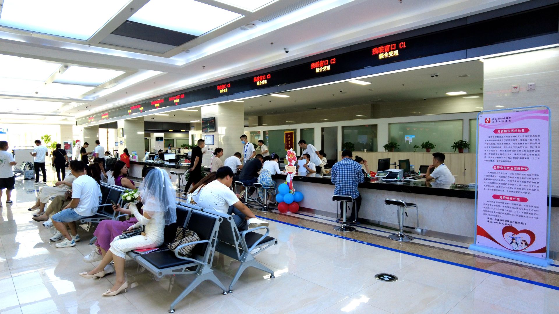 上午8点30分,记者在县政务服务大厅婚姻登记窗口看到,大厅里已经有不少新人在等候领证。