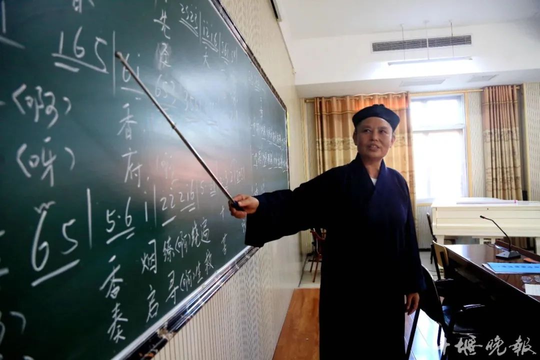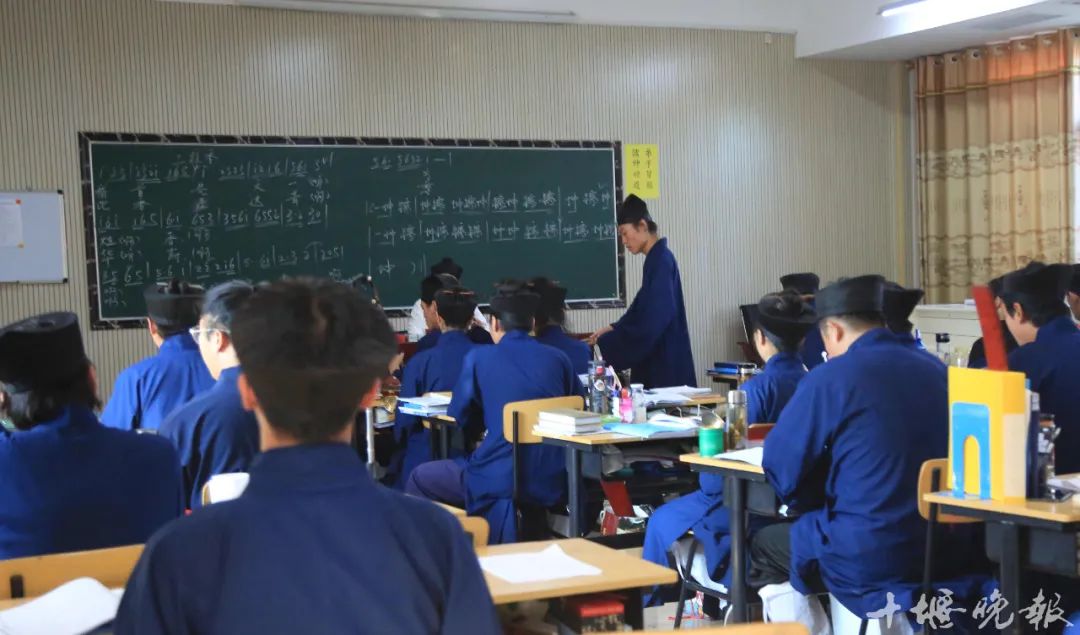 在武当山道教学院的教室内,武当山宫观道乐市级代表性传承人龚金焕正讲述武当山宫观道乐的乐理知识。