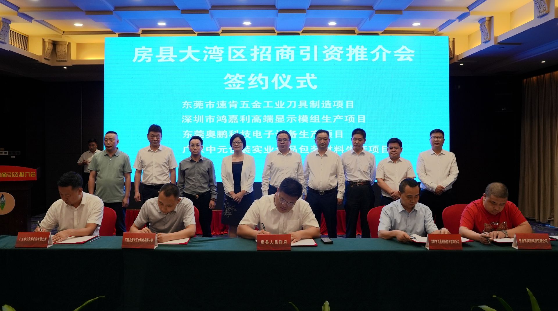 推介会上,张健代表房县人民政府分别与东莞市速肯五金公司工业刀具制造项目、深圳市鸿嘉利源高端显示模组产品生产项目、东莞奥鹏科技公司电子设备制造项目、广东中元包装实业公司食品材料包装项目签约。