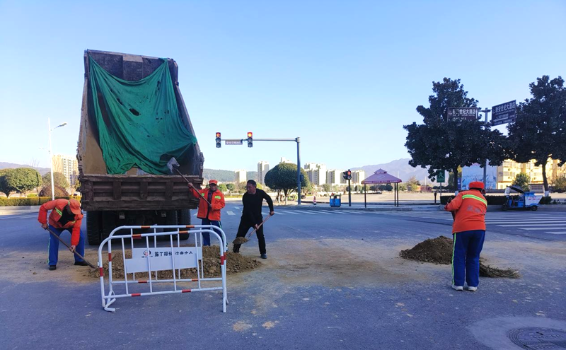 随后,执法队人员迅速联系附近的环卫工人一同帮助清理现场,在执法人员、环卫工人和司机的共同努力下,很快便将遗撒物及时清理完毕。