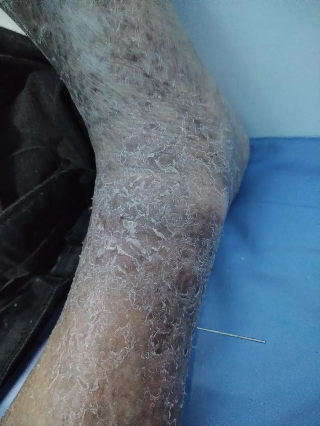 症状消失后他觉得病情已无大碍,就约上朋友一起喝酒,结果第二天皮疹迅速蔓延到双腿及腰部以上,且伴随着剧烈瘙痒。没过多久,皮疹长满了刘大爷除面部以外的全身皮肤,看起来像长了一身“鱼鳞”。“这种痒直往心里钻,无论干啥都转移不了注意力,每天只能硬熬。”刘大爷痛苦地说。
