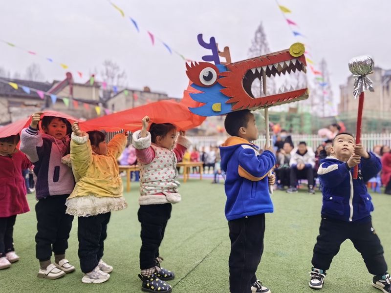 各校园里张灯结彩,亮丽一新,洋溢着欢天喜地的新年气息。军店镇中心幼儿园组织家长和幼儿们一齐动手制作和设计创意手工,五彩缤纷、形式多样,寄托了对新一年的美好期待。随后开展了精彩纷呈的传统活动,手工制作糖葫芦、五谷丰登团圆饭、巧手剪窗花、萌娃写福字、快乐舞龙灯、新年新愿亲子会等,彰显了孩子们对祖国的敬爱之情,对中国传统文化的喜爱之情。