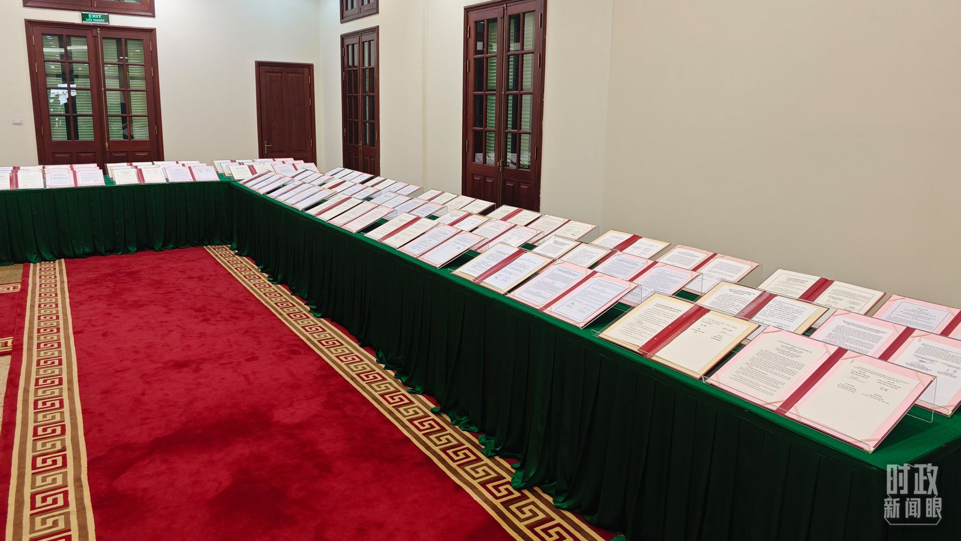 △ 2023年12月,习近平主席抵达越南河内,开启年内的第四次出访。图为中越双方签署的双边合作文件展示,涵盖共建“一带一路”等30多个领域。(总台央视记者耿小龙拍摄)