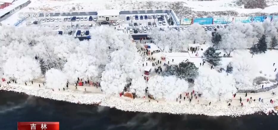 央视网消息:您现在看到的是吉林省吉林市松花江畔的雾凇景观。凝霜挂雪、晶莹剔透,处处诗情画意。 从空中俯瞰,洁白的雾凇和碧蓝的江水交相辉映,宛如一个冰雪童话世界,让人流连忘返。这个元旦假期,不少游客慕名而来观赏雾凇,感受漫步在松花江畔的冬日浪漫。