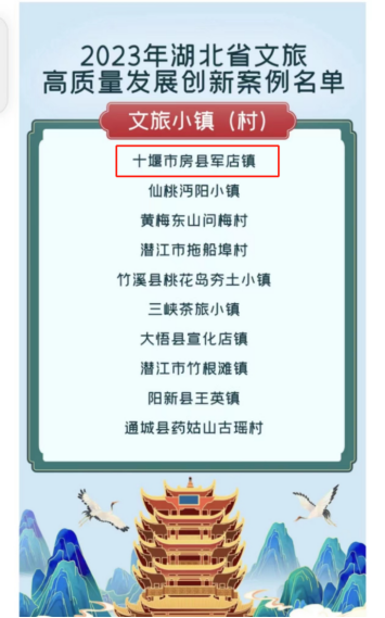 房县新闻网讯 通讯员 何翠萍 报道:展示湖北文旅IP,擦亮荆楚文旅品牌。1月11日,湖北省文旅高质量发展创新案例评选结果揭晓,十堰房县军店镇入选湖北省文旅高质量发展文旅小镇(村)类创新案例,全省仅10个镇(村)获此殊荣。