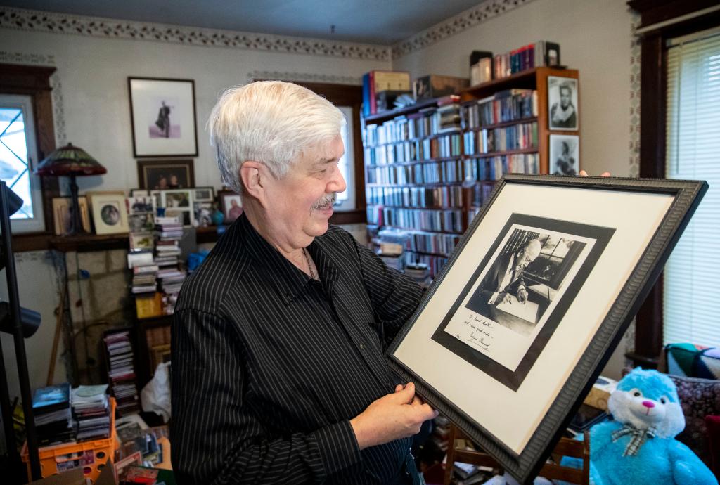 2019年1月29日,达维德·布思在位于美国新泽西的家中展示曾率费城交响乐团到中国首演的指挥尤金·奥曼迪的照片。