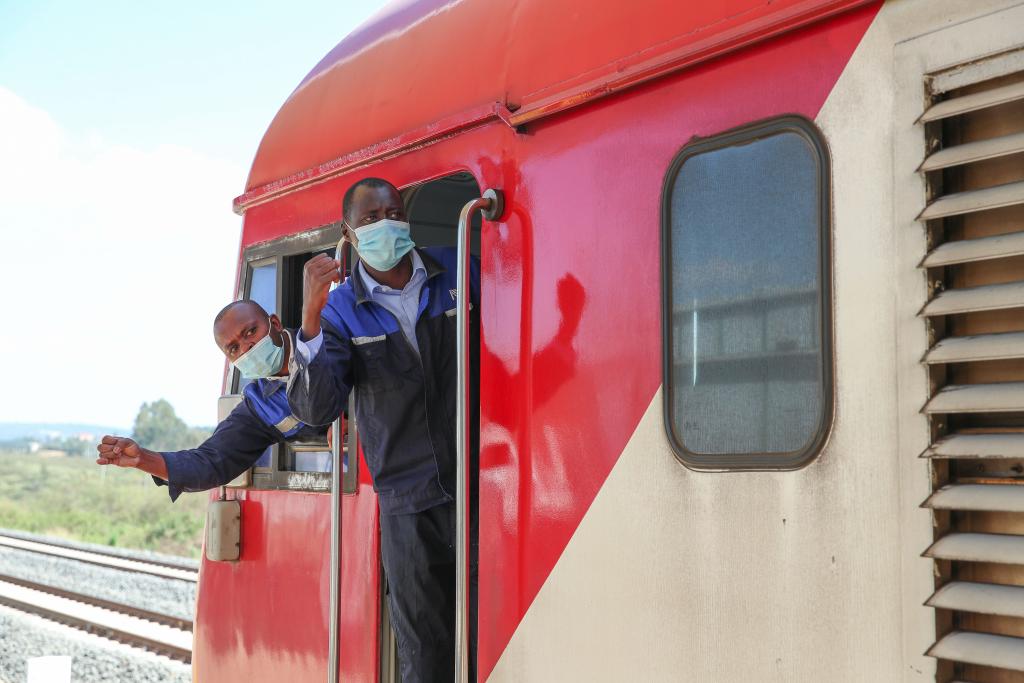 ↑2022年3月25日,在肯尼亚内罗毕,蒙内铁路肯方机车独立班组成员与站台工作人员确认安全。