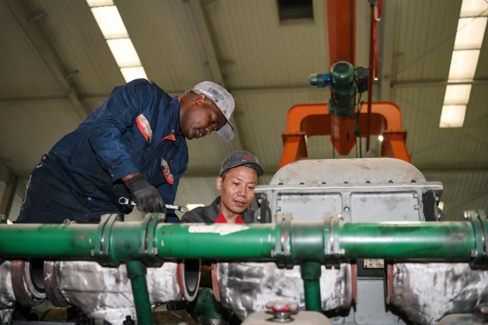 ↑2023年7月4日,中国中车驻肯员工和肯方员工在肯尼亚内罗毕的蒙内铁路机车维保车间工作。