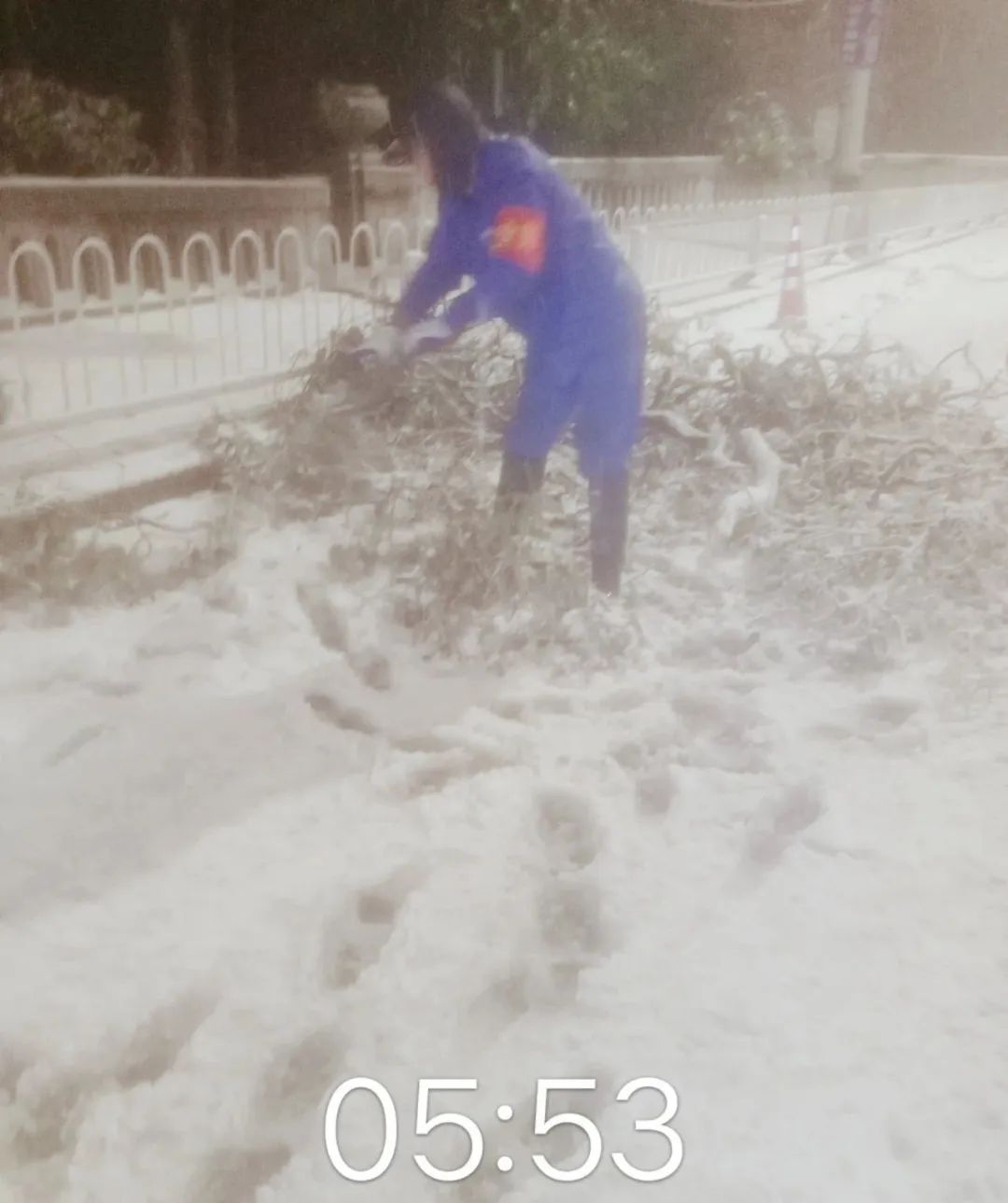 清晨4时许,5号线工人村站工作人员清除出入口积雪