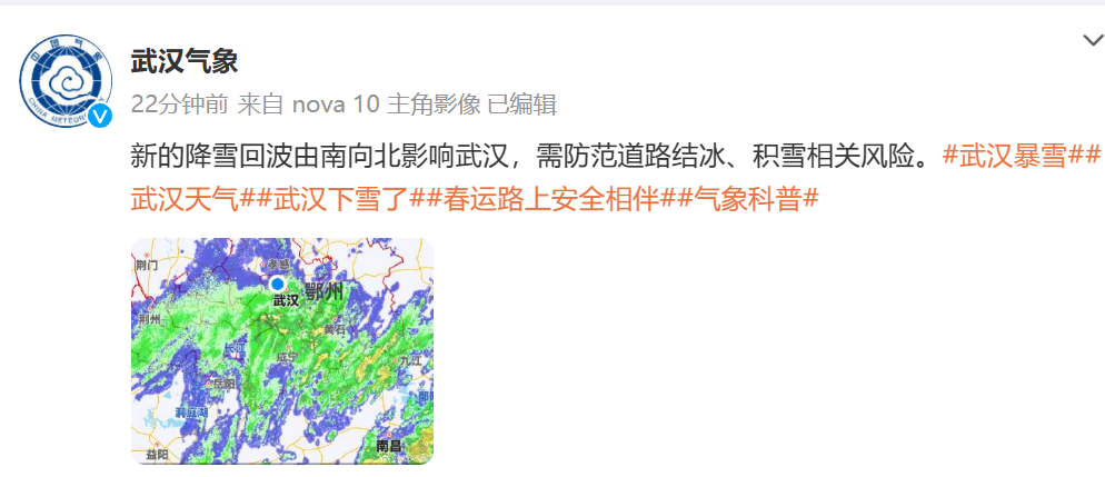 新的降雪回波由南向北影响武汉,