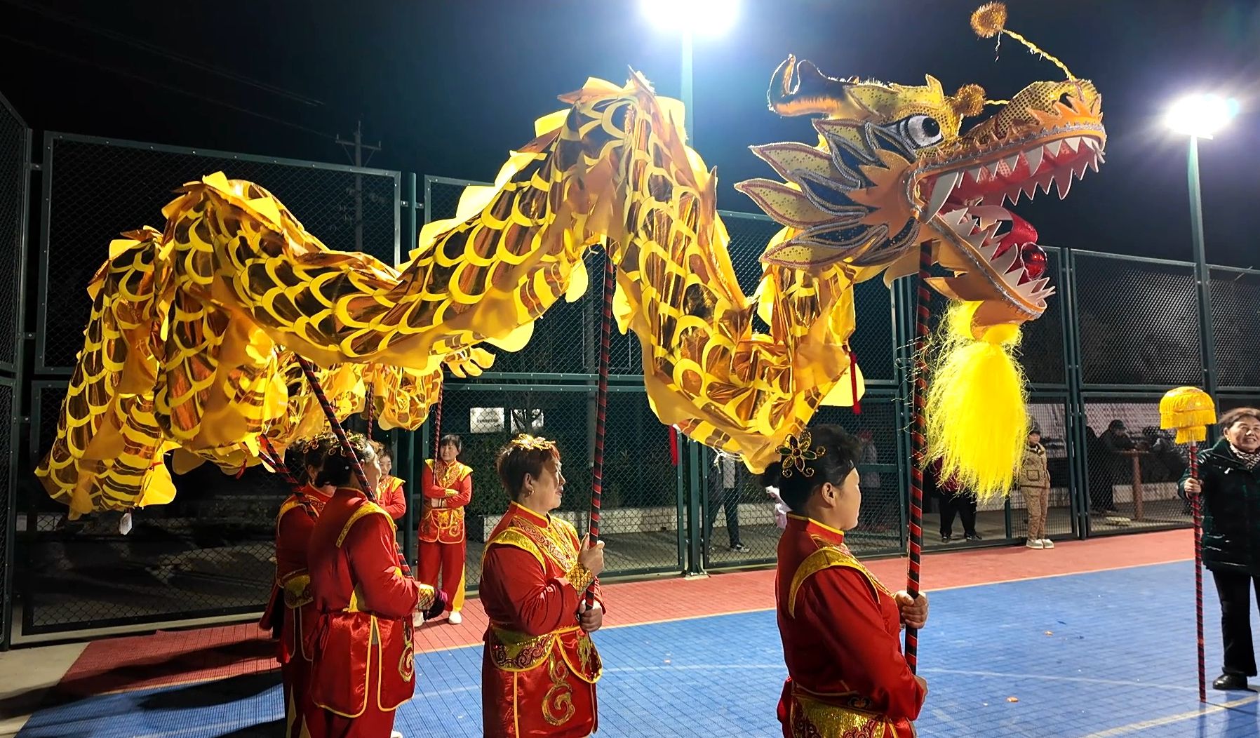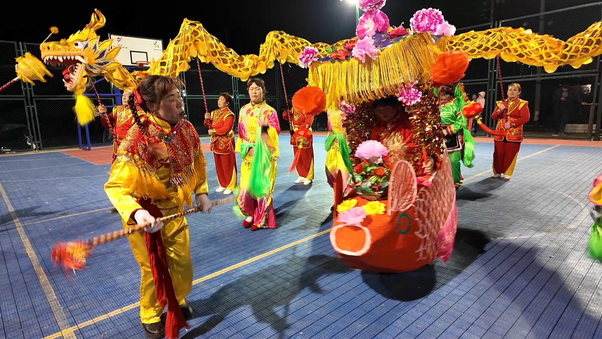 在三海村的体育场里,一边是旱船表演,一边是舞龙,精彩的表演让人应接不暇。