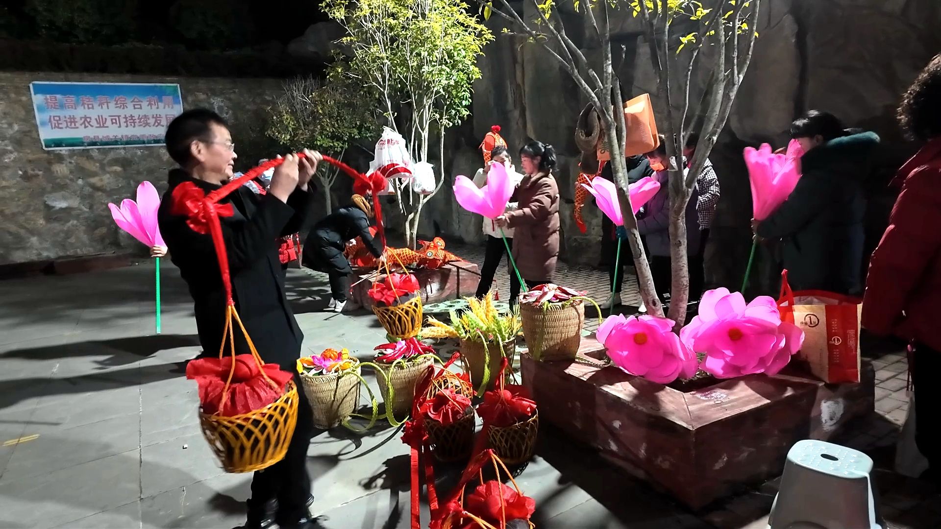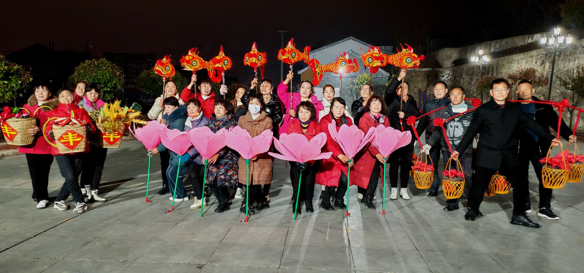 排练现场,尽管天气非常寒冷,但是参与演出排练的村民们个个热情高涨、神采飞扬,他们挥舞着手中的鱼灯和荷花,踏着舞步,欢声笑语荡漾在广场上,呈现出一片迎新春的热闹景象。