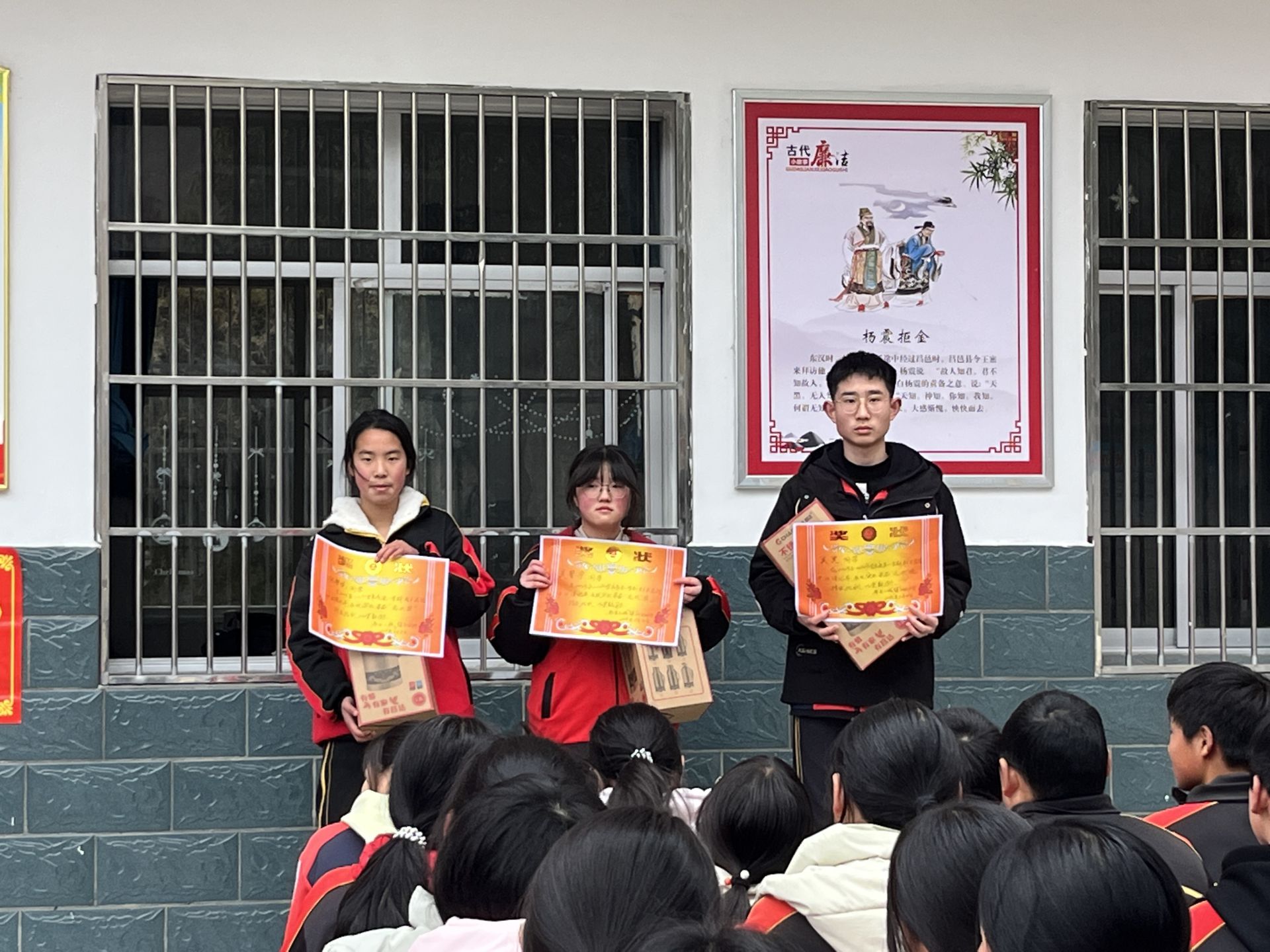 紧接着,学校表彰了2023——2024学年上学期学习标兵、优秀班干部、优秀寝室和文明班级集体。校领导分别为受表彰的个人和班集体颁发奖状和奖品;随后,教师代表号召全体学生要向优秀学生看齐,积极付出,追梦前行;不怕辛苦,挑战极限。学生代表分享了“学会学习,快乐成长”的青春誓言,号召全体学生创造属于自己的美好明天,实现自己的人生价值;学校各处室也从教学、卫生、纪律等方面做了宣讲。