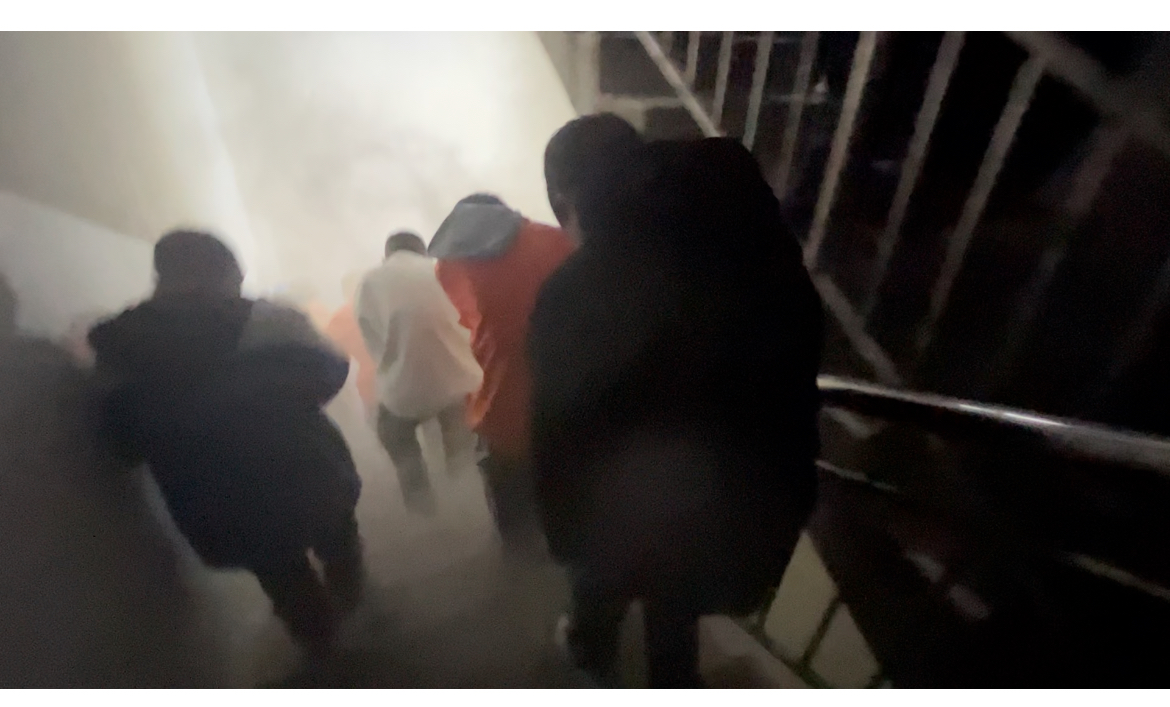 演练假设学校宿舍三楼因线路老化发生火灾,浓烟及火势扩大后逐渐向整幢宿舍楼蔓延,同时烟雾报警铃声响起,学校启动应急预案,迅速组织各楼层负责人、班主任迅速到达指定地点,组织学生沿指定路线有序向安全点撤离,并清点人数。撤离过程中,学生用湿毛巾捂住口鼻,低身前行,从相应楼道和出口,以两列纵队的形式靠楼梯右侧快速下撤逃离“火场”。