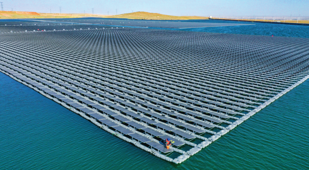 位于宁夏灵武市的国家能源集团宁夏电力公司宁东电厂3×5.98兆瓦漂浮分布式光伏发电项目(2022年6月17日摄)王鹏摄/本刊