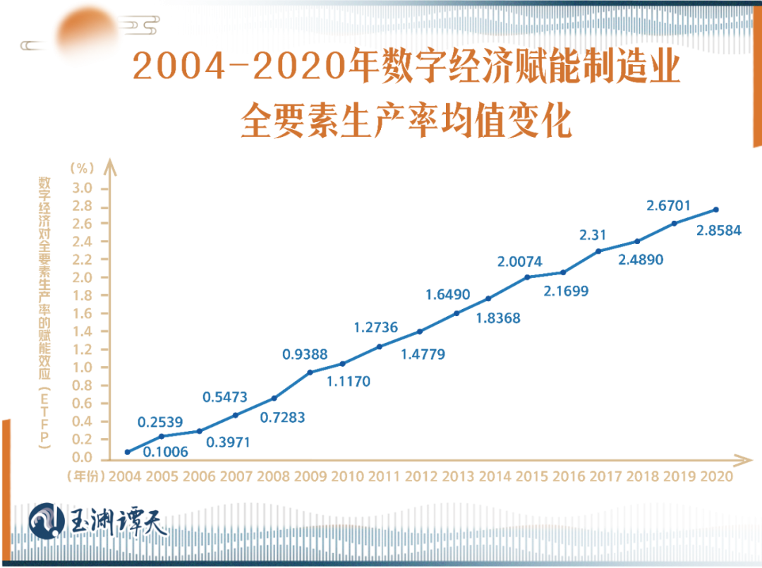 有学者做过测算,从2004年开始到2021年,数字经济赋能制造业全要素生产率效能呈逐年上升的趋势,且近年来,赋能均值达到了最高点。