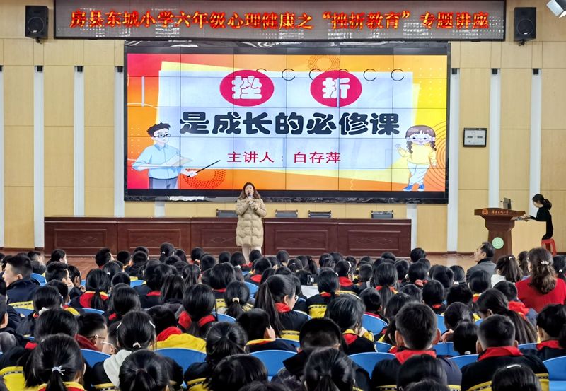 房县新闻网讯 通讯员 胡雪 报道:为帮助学生树立正确的挫折观念,培养积极应对挫折的心理素质和解决问题的能力,让学生们更加清楚地认识自我,感受自我,从而在生活中更加自信。3月18日,县东城小学国家二级心理咨询师白存萍老师面向六年级全体师生,在阶梯教室举行了一场以“挫折是成长的必修课”为主题的心理健康专题讲座。