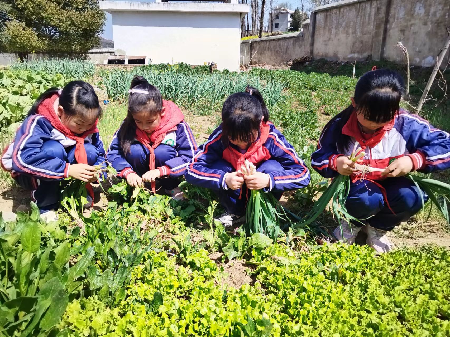 在老师的带领下,同学们化身“小菜农”,手提菜篮、小铲子有序来到菜园采摘蔬菜。采收过程中,同学们与老师一起小心翼翼,扒开菜丛把菠菜、毛辣菜、蒜苗、香菜等连根扯起,不一会儿,孩子们小小的菜篮装得满满当当,提着鲜嫩的蔬菜,孩子们惊喜地欢呼着,菜地里充满了欢声笑语。蔬菜采摘完毕,同学们分工择菜,先将虫叶、腐叶、老叶子去除,再把香菜根、菠菜根等有营养的部分保留,最后把收拾干净的蔬菜分类装篮。随后,同学们在教师引领下,进行了生菜、葱苗的移栽。“像这样葱白要埋在土里,两葱之间的距离是二到三公分,填土的时候不要太深,以免葱叶腐烂.......”教师为学生们讲解菜苗的栽培方法并现场进行示范。