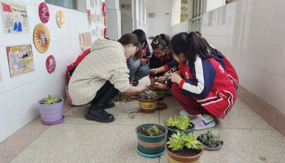 教学楼文化长廊旁,孩子们松土、扶苗、浇水,忙得不亦乐乎,师生共同播种下春天的希望,大家脸上洋溢着灿烂的笑容,呈现出一派热闹的景象。一棵棵多肉和一盆盆吊兰;清理花园垃圾、为小树剪枝松土,同学们的“绿”动让校园生机盎然!