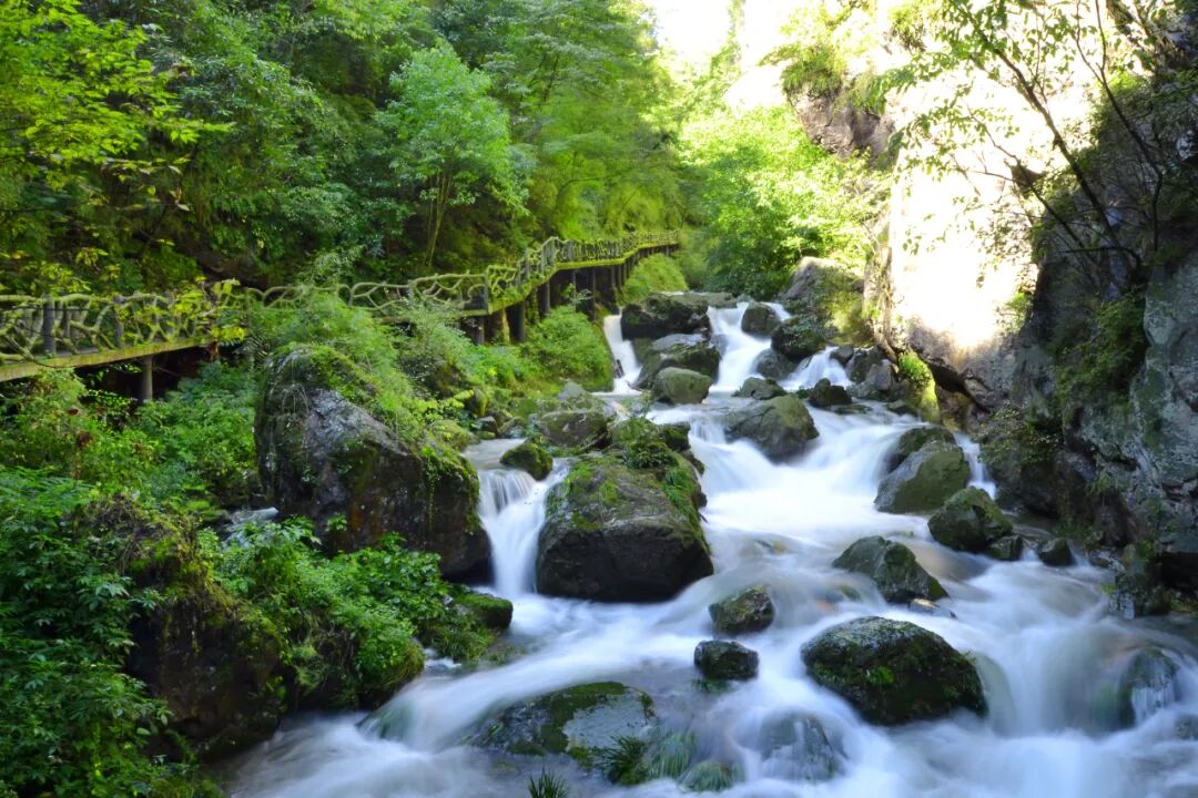 四月的野人谷、野人洞景区是凉爽的,巍巍苍山下,茫茫林海中,十里长峡,穿境而过。溪流欢歌,泉水叮咛,绝壁栈道上、奇山异水中,茂密的森林浓荫蔽日,繁花似锦。走进这里,仿佛步入世外桃源。