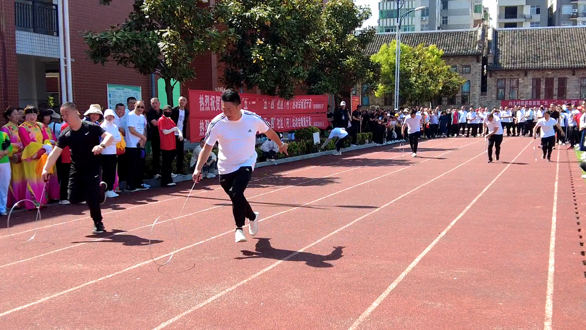 上午的活动现场,广场舞项目以娴熟的动作、优美的舞姿、饱满的精神,在舞台上释放全民健身的热情,充分展现了“普及全民健身 缔造幸福生活”的赛事主题;在滚铁环赛区,随着裁判的一声令下,运动员们用铁钩推动铁环,在跑道上迅速开始了你追我赶,银色的铁环在参赛选手的手中沿着红色的跑道滚成一个个美丽的图案,加油声、欢笑声响成一片。