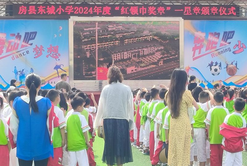 房县新闻网讯 通讯员 李英 冀曼 报道: 为深入贯彻落实共青团中央、教育部、全国少工委《关于构建阶梯式成长激励体系增强少先队员光荣感的指导意见》文件精神,构建少先队员阶梯式成长激励体系,切实增强少先队员的光荣感和组织归属感。5月27日,县东城小学在操场上隆重举行了“争章逐梦 红领巾在行动”——“红领巾奖章”一星章颁奖仪式。