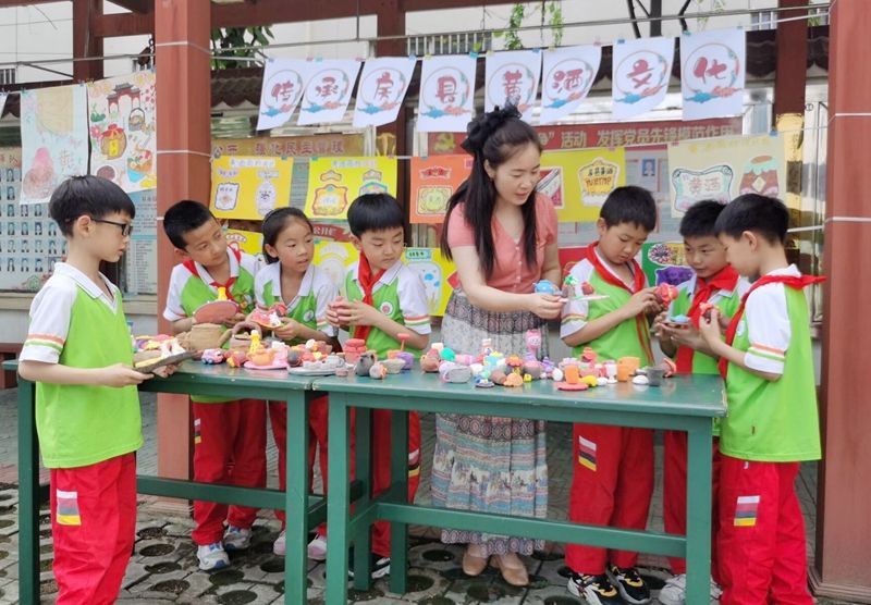 酒器设计现场,学生们拿出早就准备好的各色黏土材料,迫不及待地搓、团、捏、切、粘,将五颜六色的黏土进行组合,一会儿功夫,一块块不成型的黏土,在他们灵巧的小手中,变成了一个个精美典雅、复古大方的酒器,一件件酒器制作,无不传承与发扬着房县地域特色的黄酒文化,无不表达着孩子们对黄酒文化的热爱。