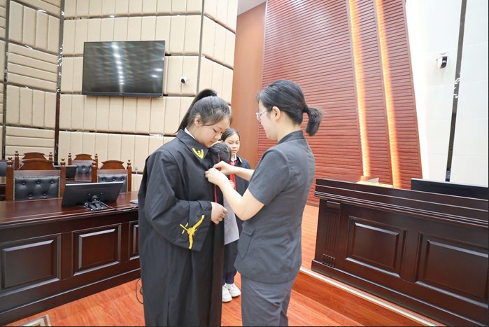 从庭前准备、庭审程序,到领带佩戴、制服着装、值庭仪态、语气动作等,法院干警耐心细致地给扮演角色的学生作了指导和讲解。