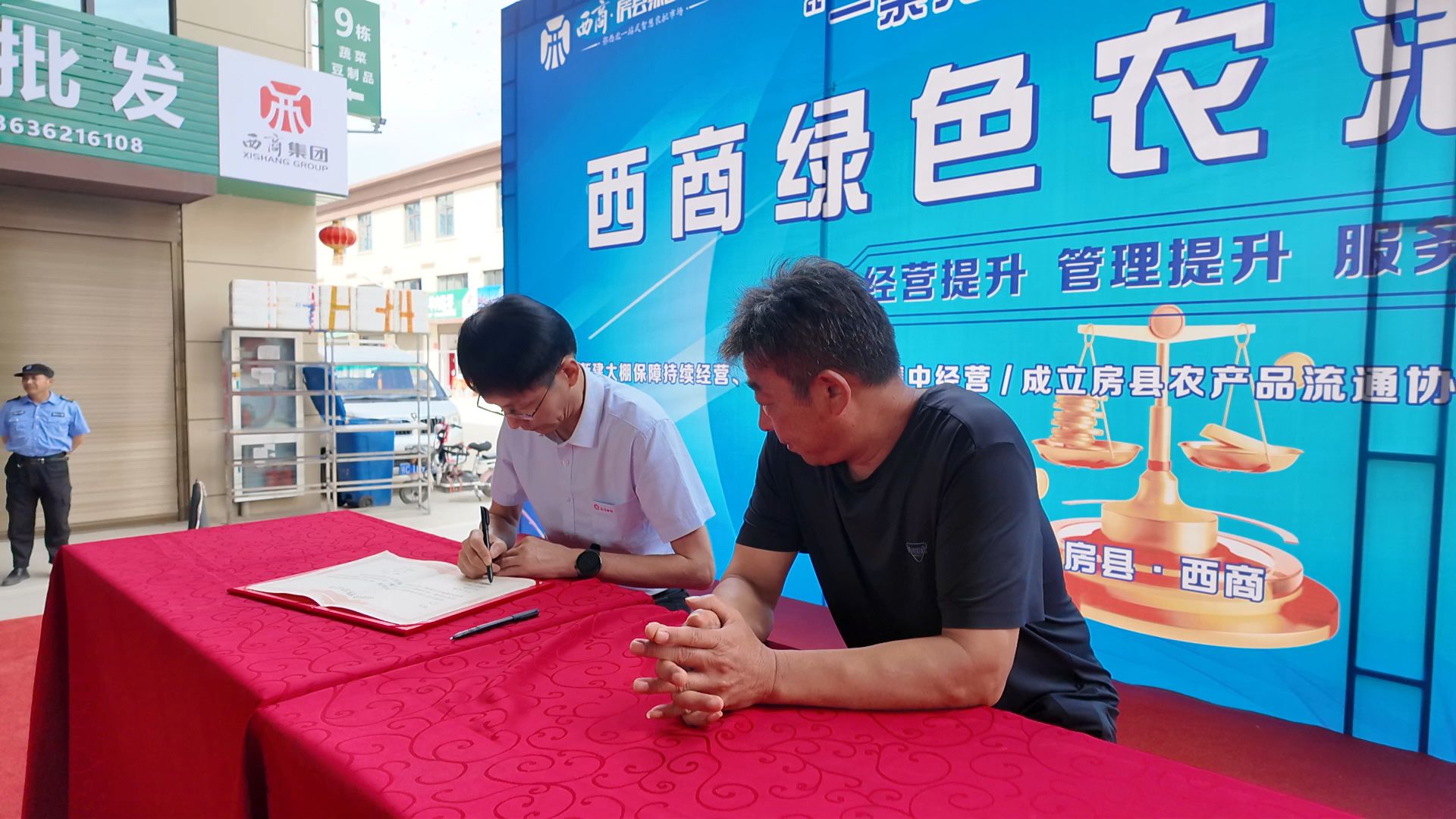仪式上,西商房县绿色农港与商户代表、白鹤镇种植户代表分别签订《诚信经营承诺书》、产销对接战略合作协议。