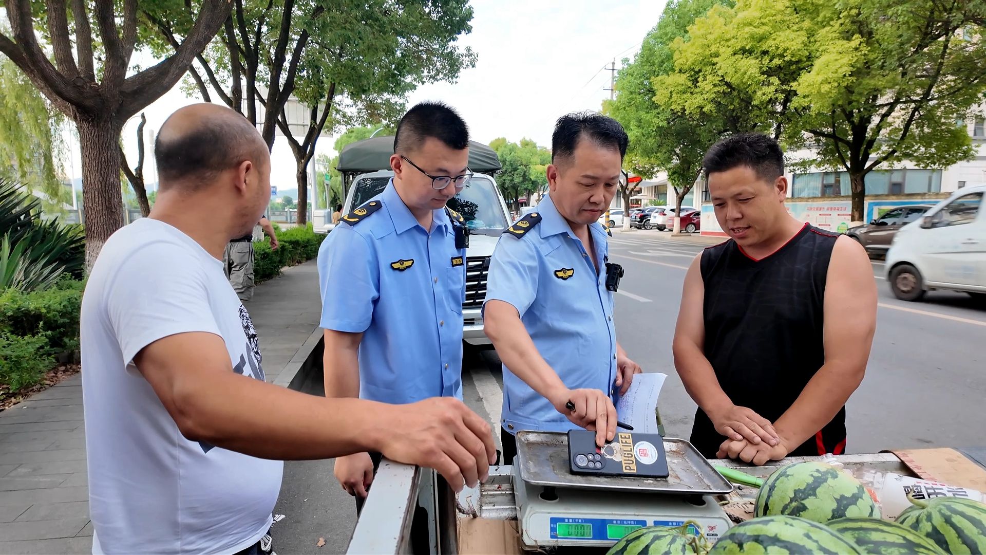 在城区沿河路段,执法人员对流动摊贩正在使用的计量器具进行了检查。现场检查了计量器具的量值是否准确,查看了秤体是否贴有绿色的检定合格标签并在检定合格期内,同时查验了铅封是否完好。