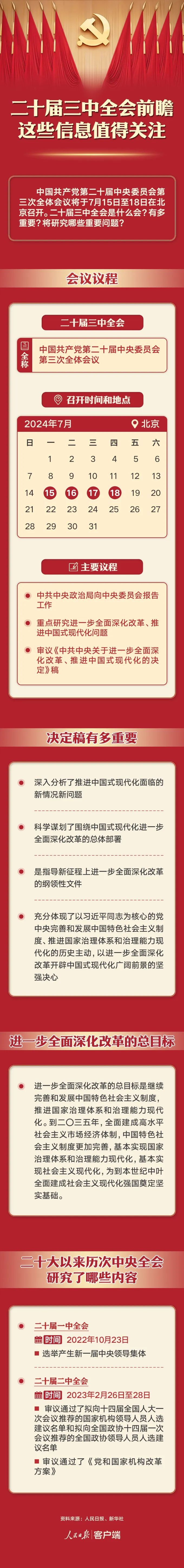 党的二十届三中全会召开前夕,人民日报客户端梳理刊发了一组题为《二十届三中全会前瞻,这些信息值得关注》的图文。
