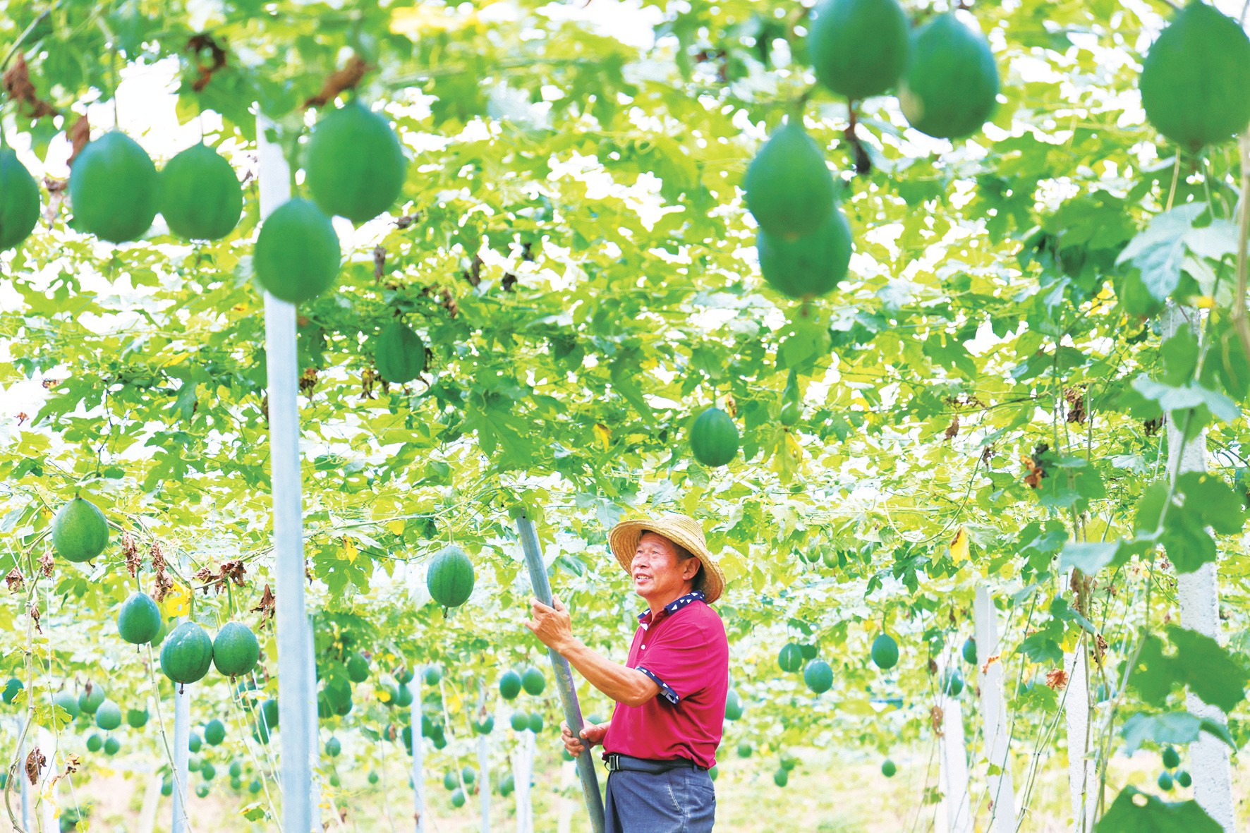房县新闻网讯 通讯员 何亮 报道:7月13日,记者在房县军店镇中村村吊瓜种植基地看到,瓜藤上挂着一个个圆润饱满的吊瓜,农户正对吊瓜进行精心管护。吊瓜又称“药瓜”,果实、皮、根皆可入药,具有“一年种植,多年受益”特点。该村种植吊瓜200余亩,亩均收益达5000元以上。