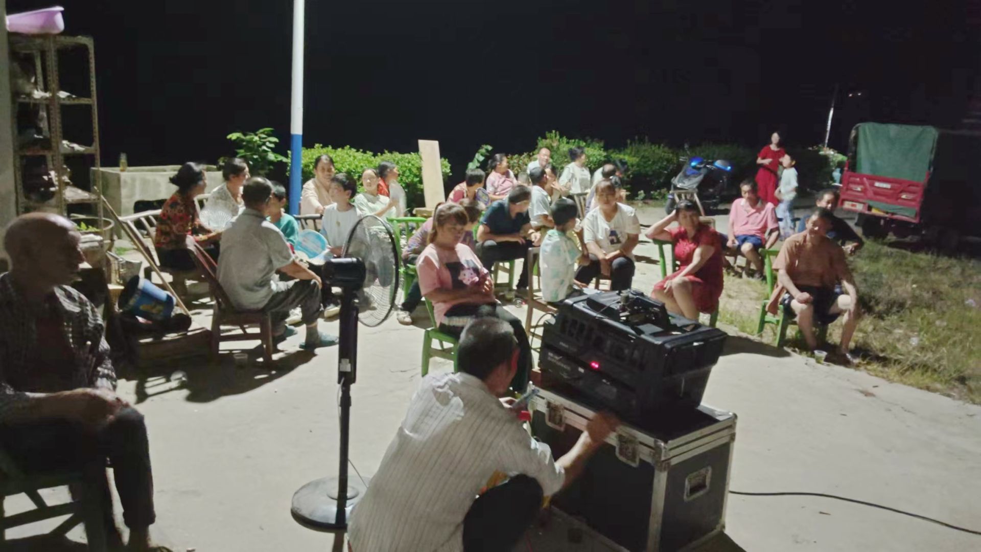 天还没黑,虎尾沟村对寺河小区广场上放映员正在安装放映设备。幕布架起,连接音响,调试机器,一切工作准备就绪。闻讯而来的村民们或坐或站,等待着电影的开场。