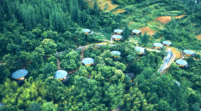 房县酒神湾度假村建造之前周边是一座废弃矿山,2022年,房县人民政府为发展生态产业,带动当地经济发展,统筹协调生态环境,景观建设,自然资源的可持续利用,采取地质灾害隐患治理、地形重塑与植被修复、废弃土地复垦利用,以及生态修复配套提升和生态环境监测等举措,将生态修复和经济转型有机结合起来,以乡村度假为主题,利用山林作为空间载体和核心发展区域,将废弃矿山治理成优美山川自然生态风景,实现了“矿区变景区”的“绿色转化”。