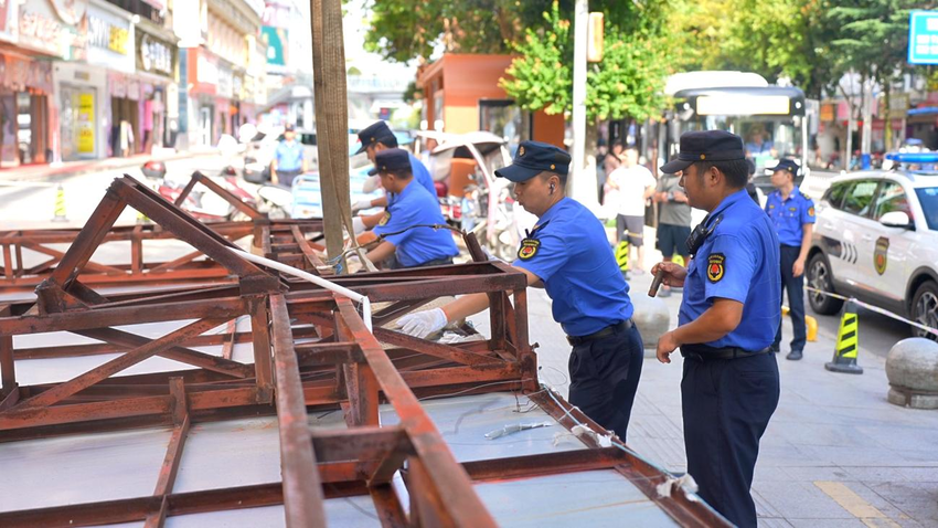 商贸城及九八家电城位于城区中心,人流密集。鉴于楼顶广告体积重量、行人安全等多方面因素,需要相应的作业空间,拆除难度较大。为最大程度降低拆除工作对交通行人的影响,执法队员在与产权单位进行了多次沟通协调并取得其配合和支持后,制定了周密的拆除计划,调集专业拆除设备和人员,选择在气温相对较低、行人较少时进行错峰作业。