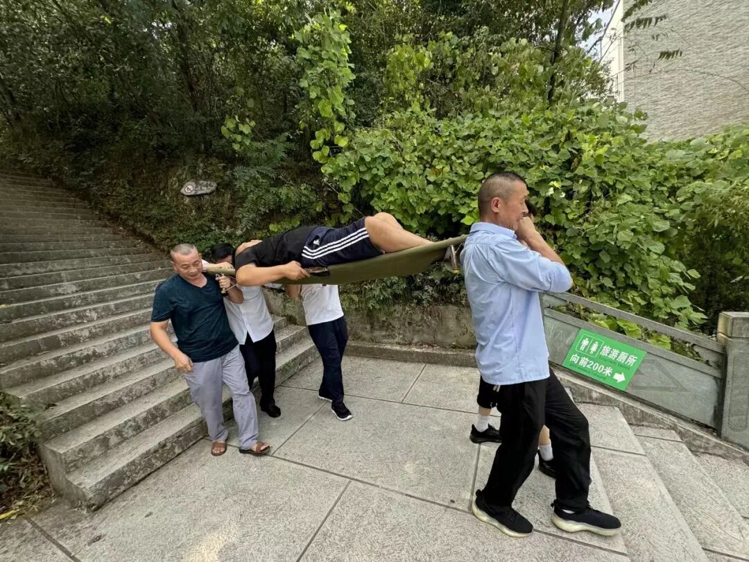 救援过程中,五位男性工作人员不畏艰难,轮番上阵,用担架小心翼翼地将受伤游客抬着,遇到楼梯时更是小心翼翼,生怕造成二次伤害。在平坦路段,他们则改用轮椅推行,确保每一步都平稳而安全。同时,一位细心的女性工作人员全程负责协调与安抚工作,她不停地提醒游客注意安全,用温柔的话语安抚着受伤游客的情绪,让她感受到家的温暖与关怀。