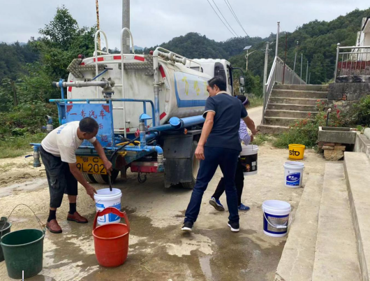 在栗子坪村大龙庙小区,一辆洒水车缓缓驶入,伴随着一声汽笛,村民纷纷提着自家水桶前来接水,看着清澈的水装满大桶小桶,大家喜笑颜开、拍手称赞。“太感谢你们了!这几天我们家里水量很小,有时还会停水,特别是干完农活,洗把脸都是问题,很不方便。”李大婶笑呵呵地说。